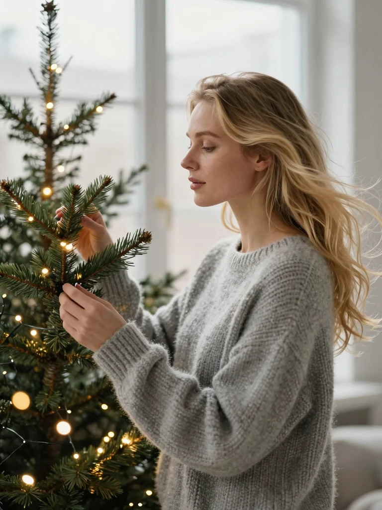 A contemplative woman with long flowing golden blonde hair wearing a rustic cream knitted off-shoulder sweater, reaching up to touch a large rustic brown Christmas ornament hanging from dark evergreen tree branches, warm golden bokeh lights creating a dreamy out-of-focus background with circular light orbs, soft natural window light illuminating her profile from the side, intimate close-up portrait shot with an 85mm lens at f/1.4 for extremely shallow depth of field, cozy festive atmosphere with muted earthy tones of browns, creams, and warm golds, the woman's face partially visible in soft focus showing peaceful expression, Christmas tree branches with needles slightly out of focus in foreground, cinematic holiday portrait photography with a natural candid feel, capturing quiet moments of Christmas preparation and reflection, reminiscent of lifestyle photography by Elena Shumilova.