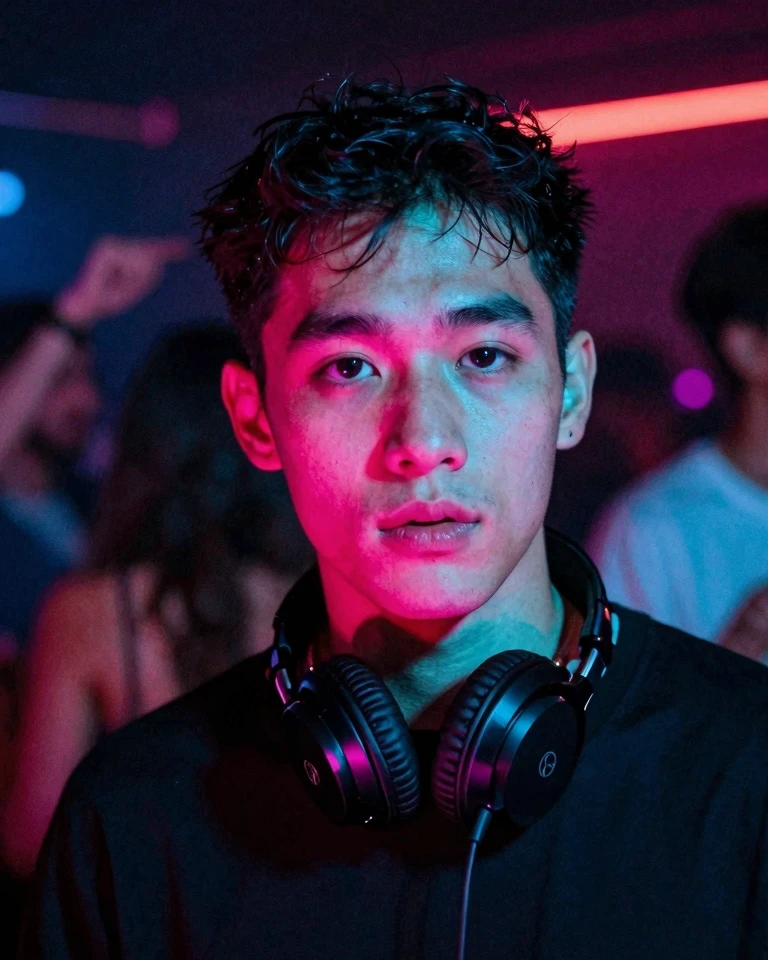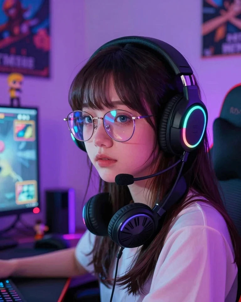 A young boy or teenager sitting at a gaming setup with RGB keyboard and colorful LED lights, multiple monitors displaying vibrant game graphics, wearing headphones, photographed in a dark room with only RGB lighting creating colorful rim lights, shot with a 35mm f/1.8 lens, gaming and esports photography style, highly saturated neon colors with strong contrast, medium depth of field showing gaming environment details.