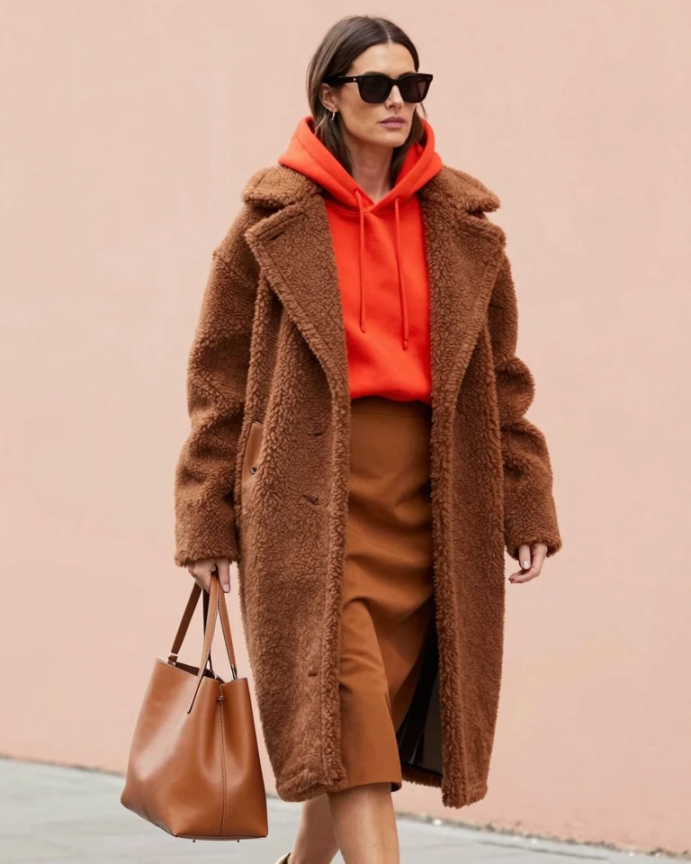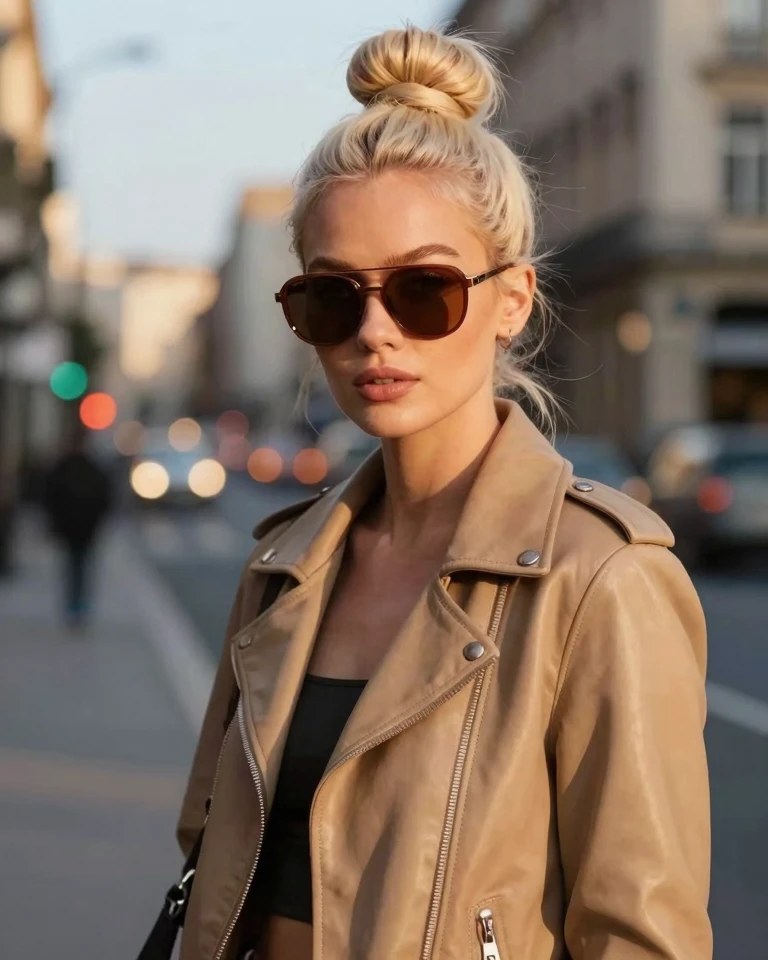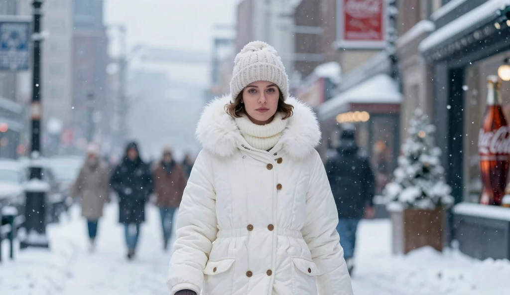 A blonde woman wearing a cozy cream turtleneck sweater and winter coat standing in an urban setting with soft overcast winter daylight, cool color temperature around 7000K, shot with a 50mm f/1.8 lens, contemporary fashion street style photography, muted desaturated color palette with cool tones and soft contrast, shallow depth of field with urban architecture softly blurred in background.